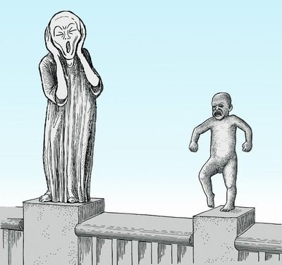 Verdens mest kjente angstfylte person er plassert i et vell av muntre situasjoner, og Arvid viser også hvordan 17 kjente kunstnere (Picasso, Michelangelo, van Gogh, Dali, Cezanne, Magritte, Chagall, etc) muligens kunne valgt å legge inn Skrik i sine kunstverk. 14 av disse tegningene ble utstilt på Henie Onstad kunstsenter ffor få år siden.